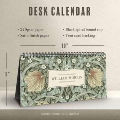 Experience the timeless charm of our William Morris Pimpernel Desk Calendar. Featuring exquisite designs from the Arts and Crafts Movement, each month showcases intricate floral and nature-inspired patterns, perfect for adding a touch of elegance to your workspace.